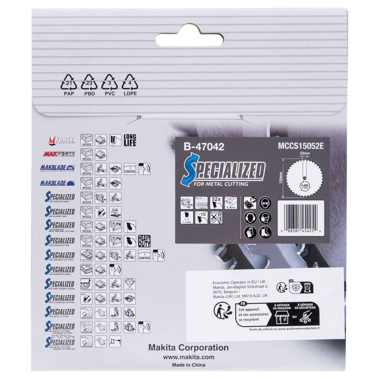 • 1 Makita B-47042:Specjalistyczne ostrze tarczowe TCT 150 mm z 52 zębami do cięcia metalu.