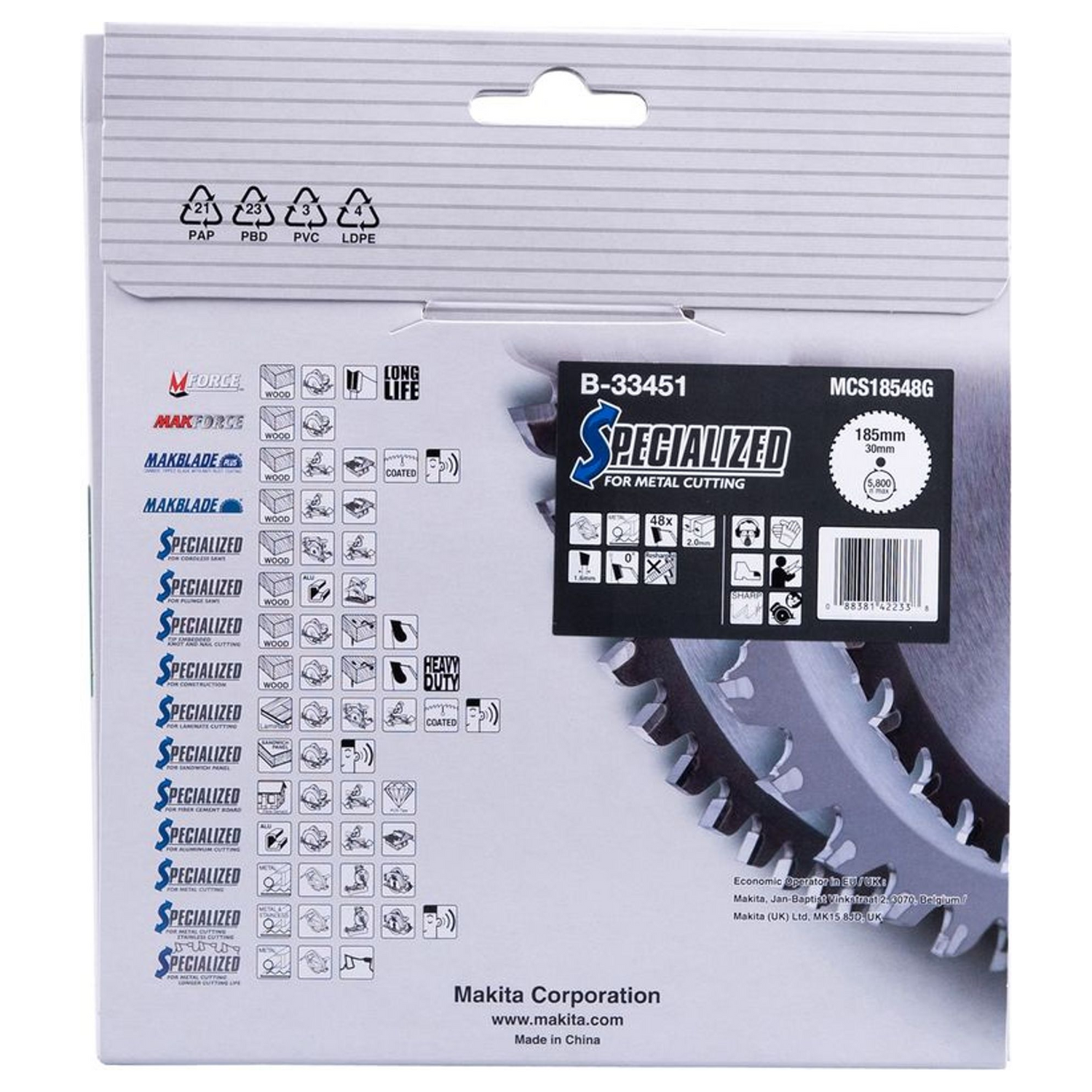• 1 Makita B-33451:Specjalistyczne tarczowe ostrze TCT 185x30mm 48 zębów do cięcia metalu.