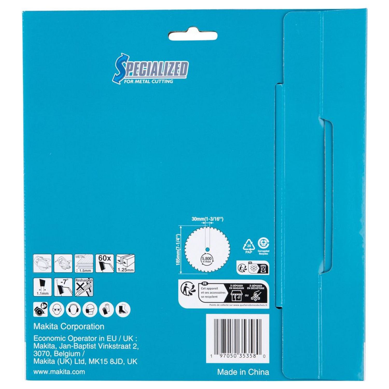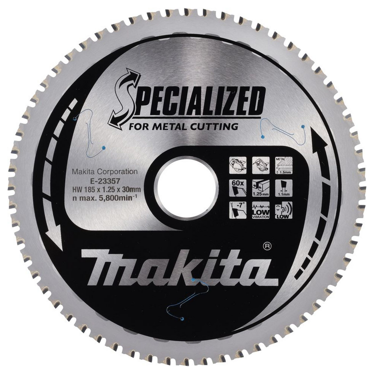 - 1 Makita E-23357: lama TCT 185x30mm con 60 denti per taglio metallo sottile.