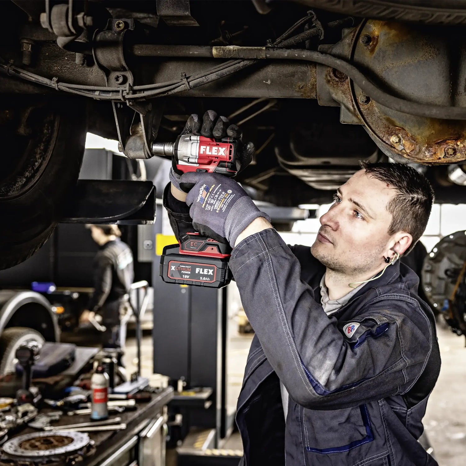 Il Flex IW 1/2" 400 18.0-EC è ideale per avvitature ad alta coppia su bulloni e dadi, perfetto per officine, cantieri e montaggi strutturali grazie al controllo su tre velocità e alla potenza elevata.