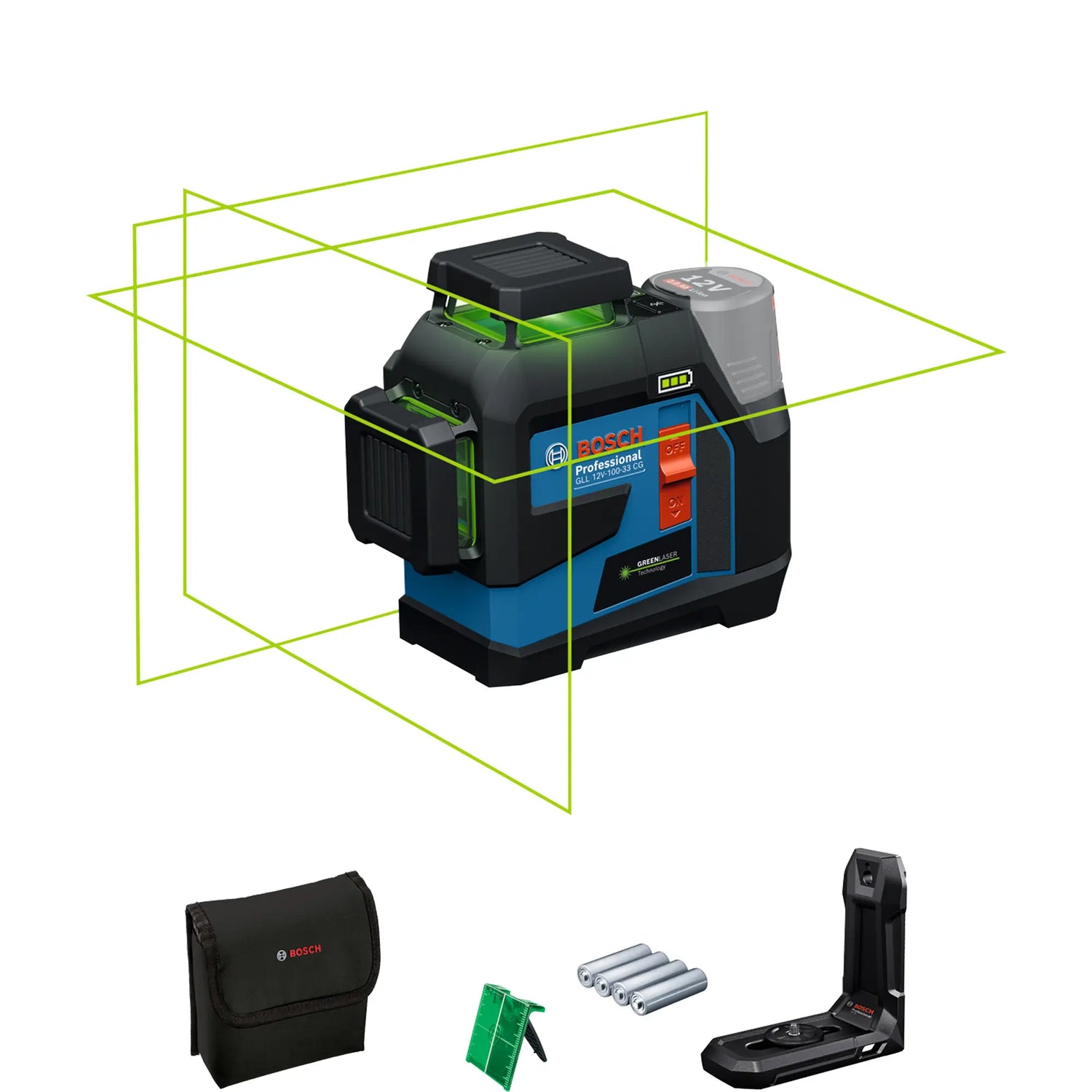 Livella Laser Bosch GLL 12V-100-33 CG 12V con 3 linee verdi a 360°, controllo remoto app e doppia alimentazione per massima versatilità.