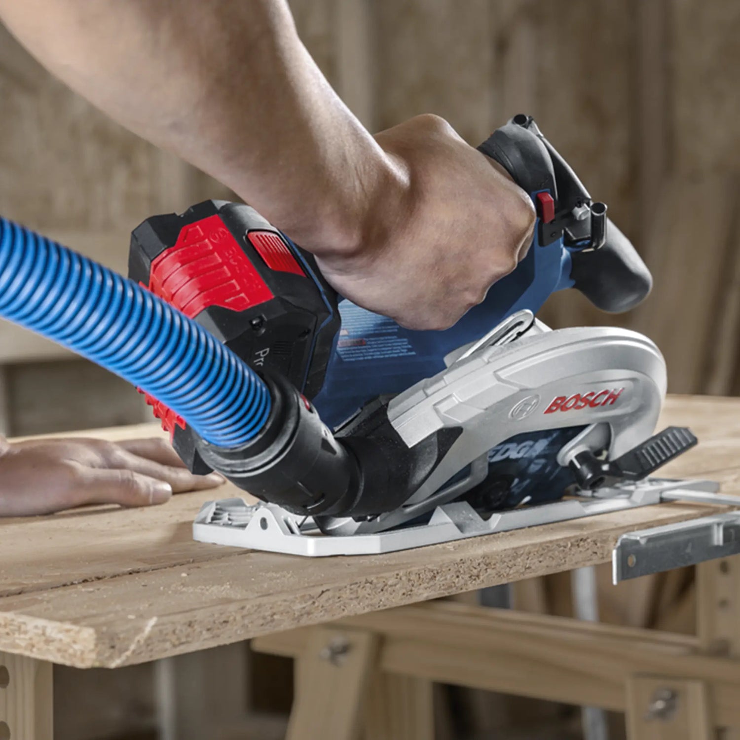 Piła tarczowa Bosch GKS 18V-68-2 PRO 18 V z systemem KickBack Control i bezszczotkowym silnikiem do profesjonalnego cięcia drewna i twardych materiałów.