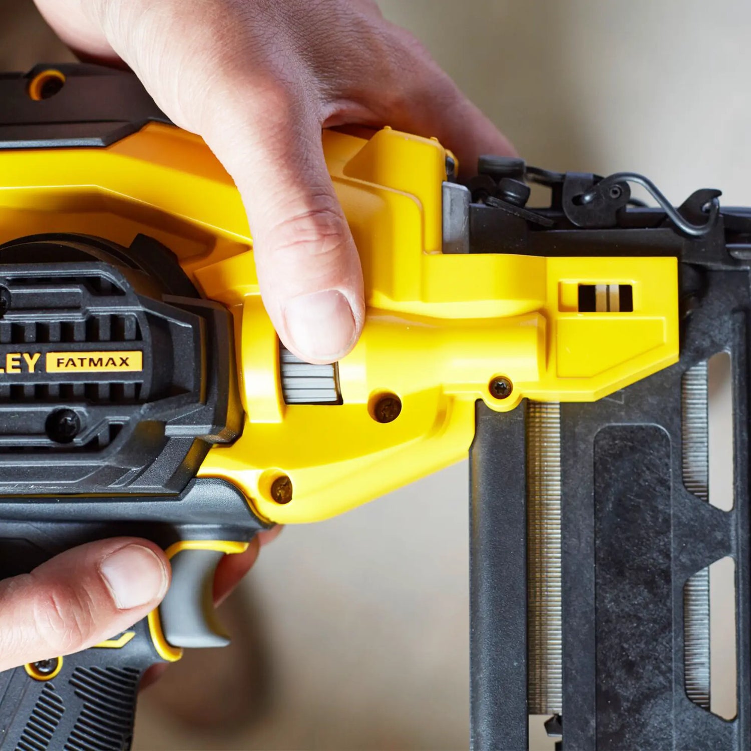 Tam Gwoździarka Stanley SFMCN616D2K-QW charakteryzuje się prostym i szybkim systemem regulacji głębokości.