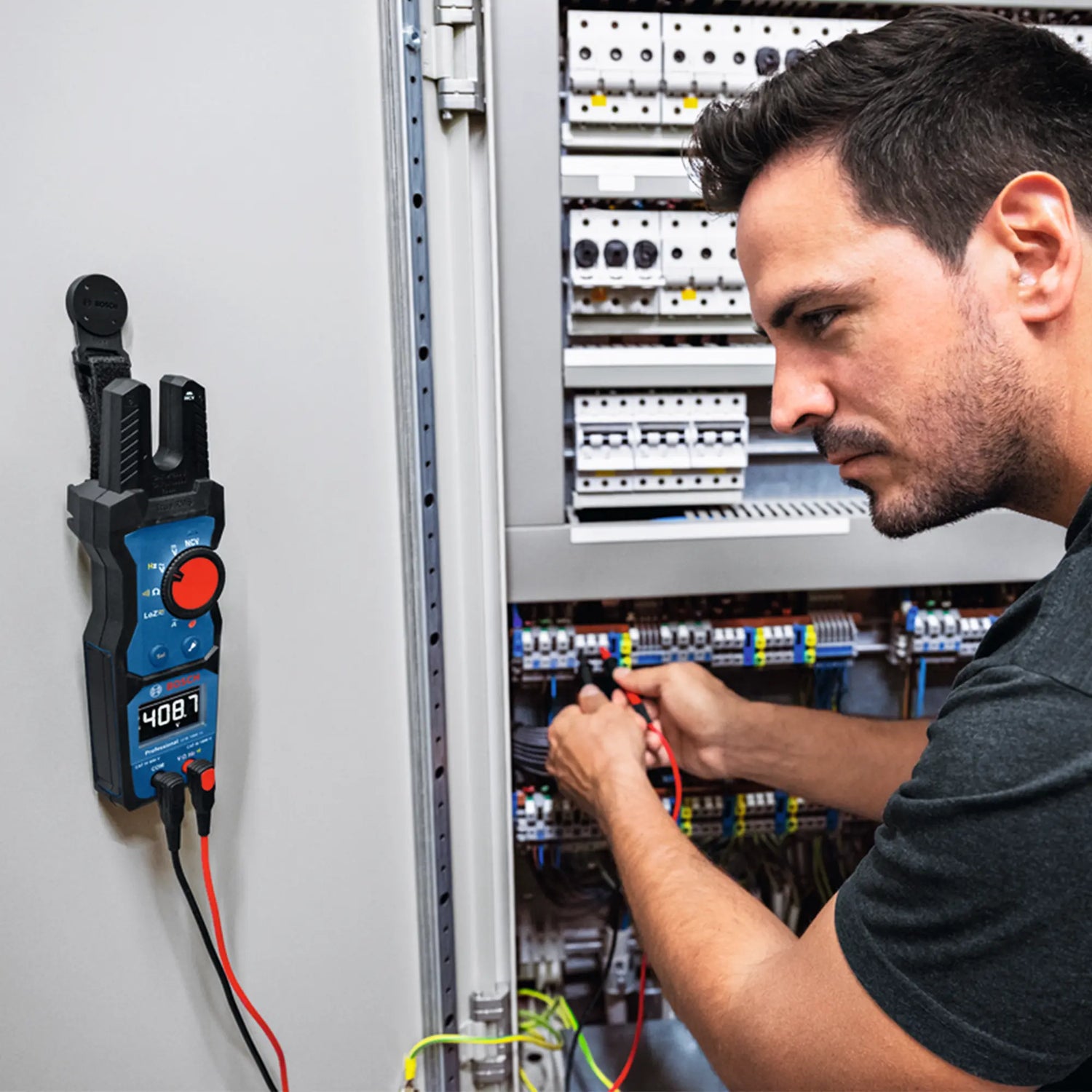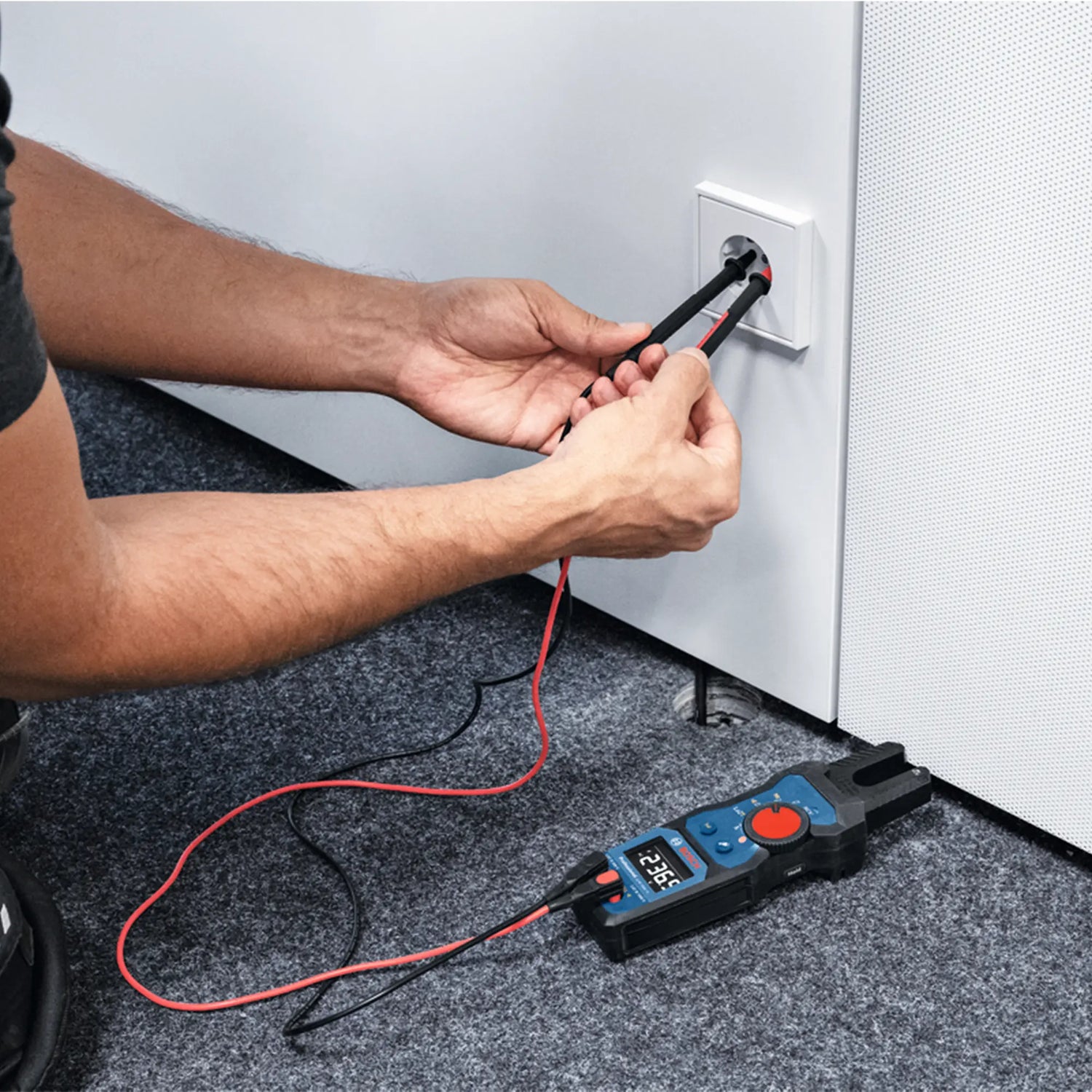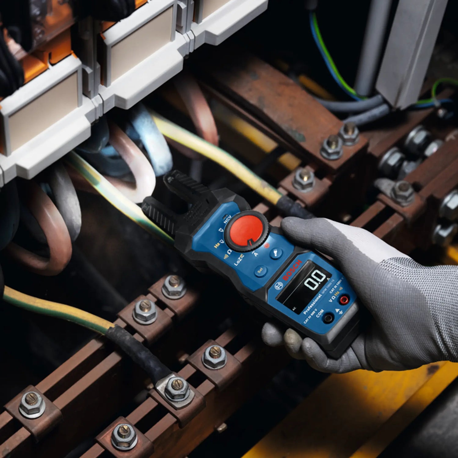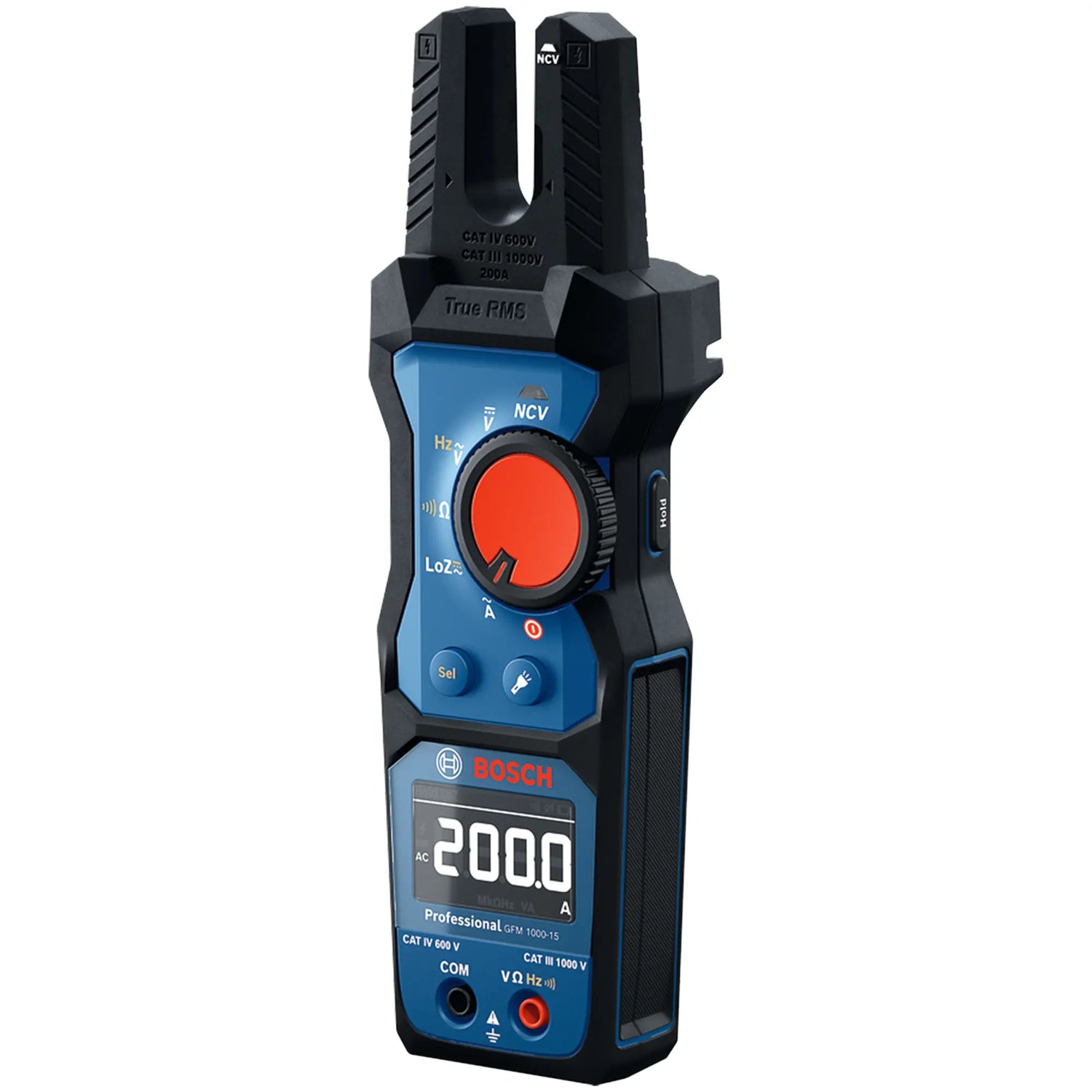 Zacisk prądowy Bosch GFM 1000-15, DoNiezawodny i wytrzymały amperomierz widełkowy True RMS z odwróconym ekranem LCD do szybkiego pomiaru prądu przemiennego.