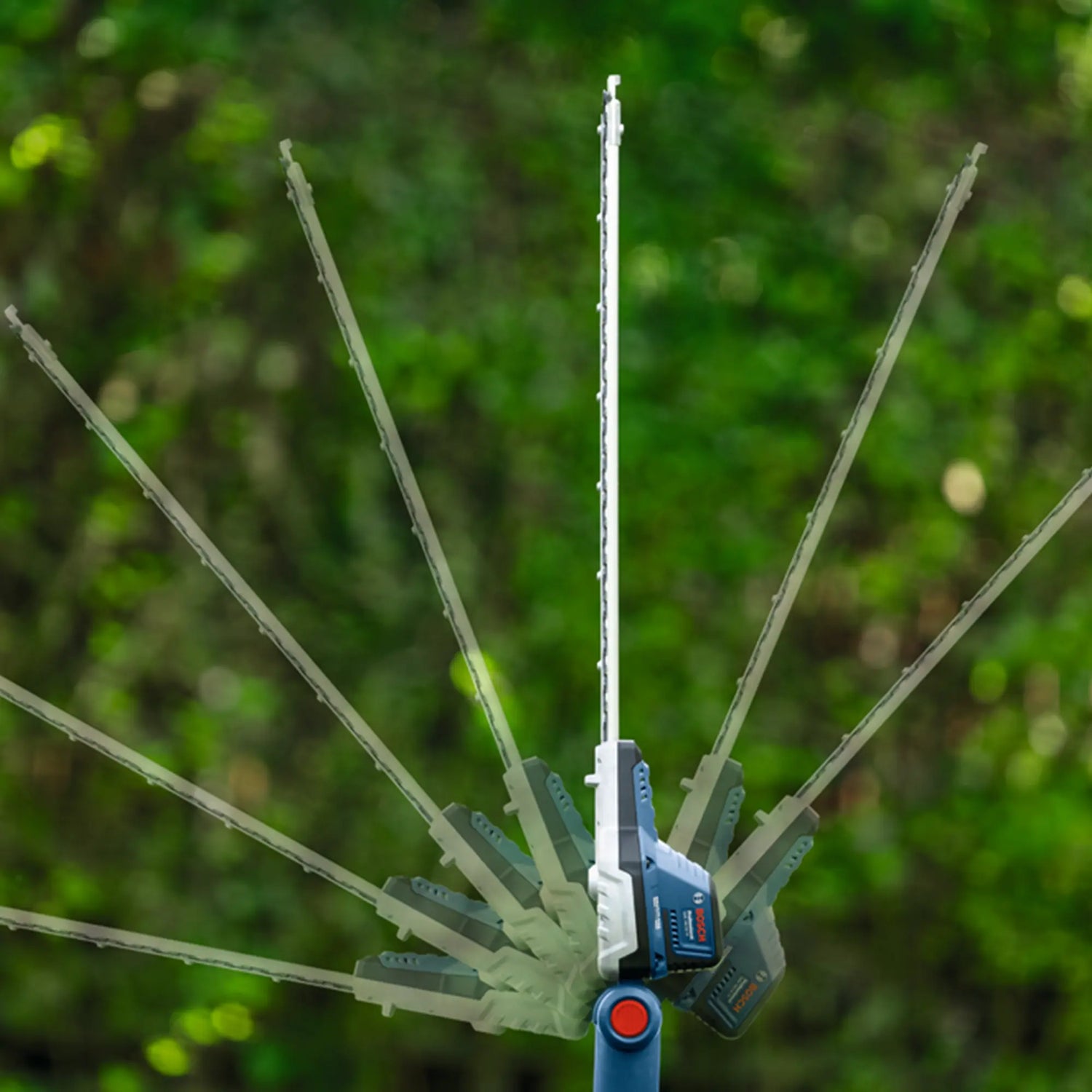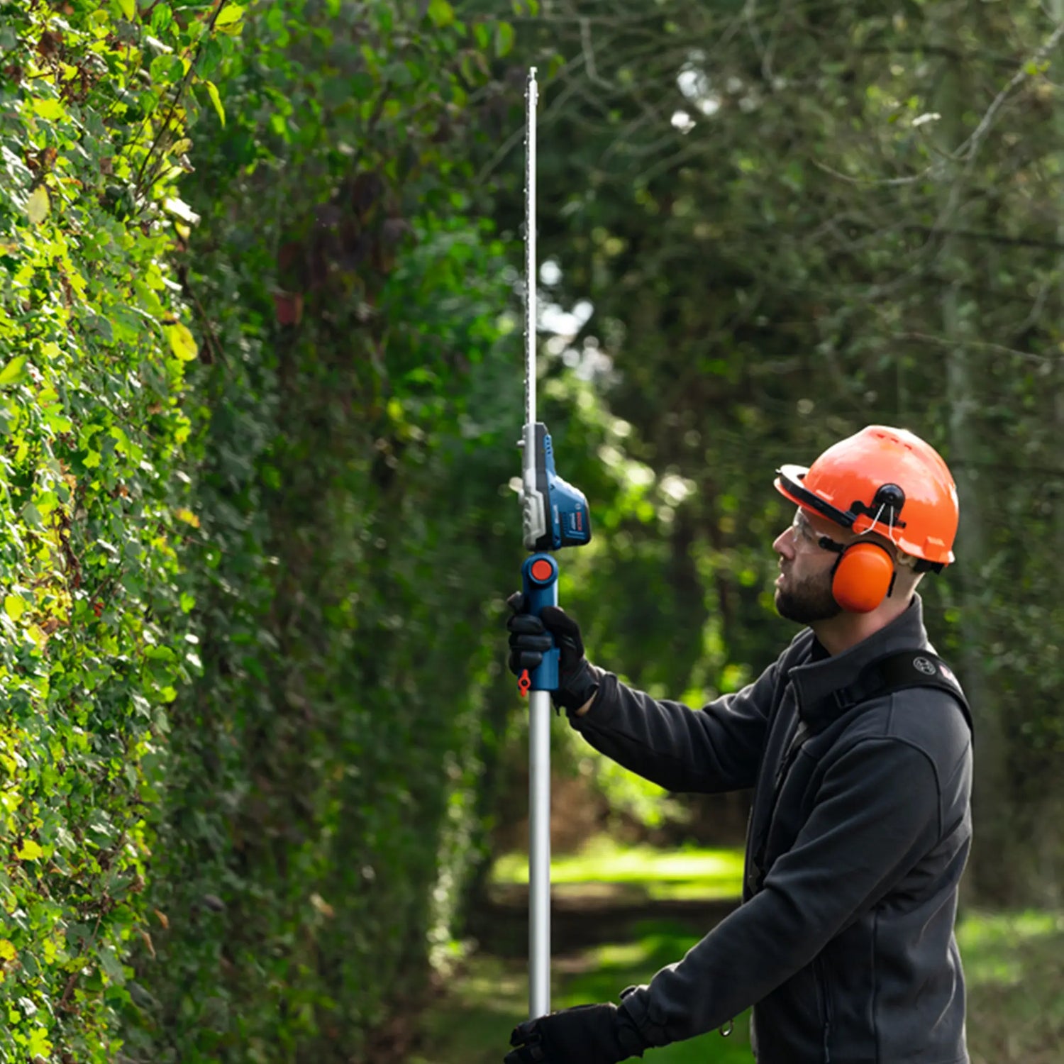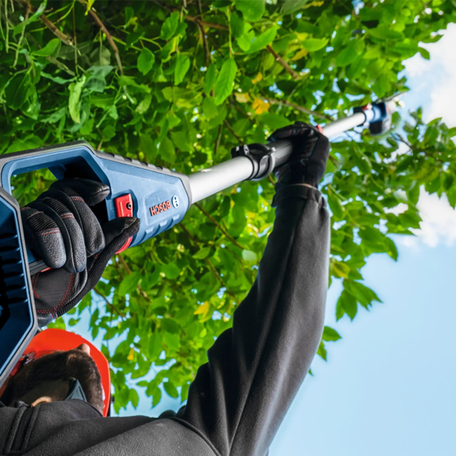 Ten Bosch GHE 18V-50 TP Bezprzewodowy teleskopowy trymer do żywopłotu To idealne rozwiązanie dla tych, którzy chcą łatwe przycinanie wyższych żywopłotów bez wysiłku i bez użycia schodów. Dzięki temu uchwyt teleskopowy do 2,5 metra i do kątowa głowa, umożliwia precyzyjne przycinanie nawet najtrudniej dostępnych końcówek. Wyposażony w silnik bezszczotkowy I elektroniczna regulacja prędkości, zapewnia mocne i gładkie cięcie nawet przy grubszych gałęziach.